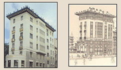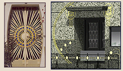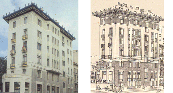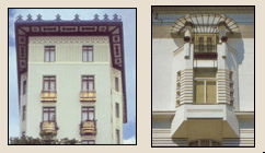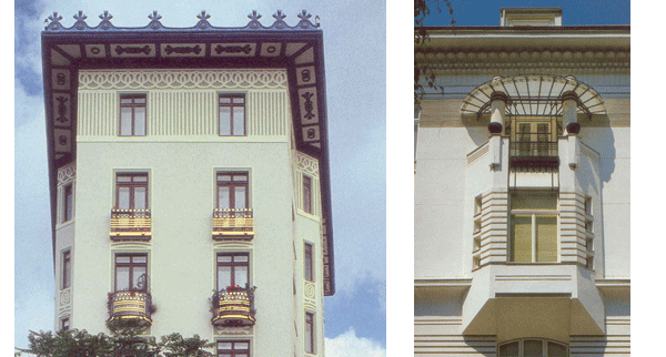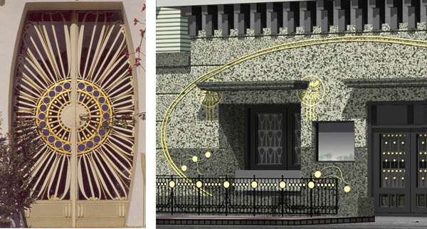 窗台欄杆金屬鍛造,深色欄杆線條裝飾新藝術風格的金色圓形幾何。祖母綠百年花崗岩基座,基座頂端與圍牆柱頭裝飾的崁燈鍛造家徽,一樣置入黃金色彩元素,讓整座建築洋溢著新藝術風格的華美與浪漫。